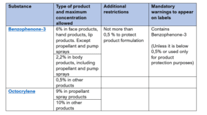 Cosmetics with below UV filters can no longer be on the EU market, if they do not meet the new restrictions. Have a look at the table below to see the applicable concentration limits included in Annex VI: